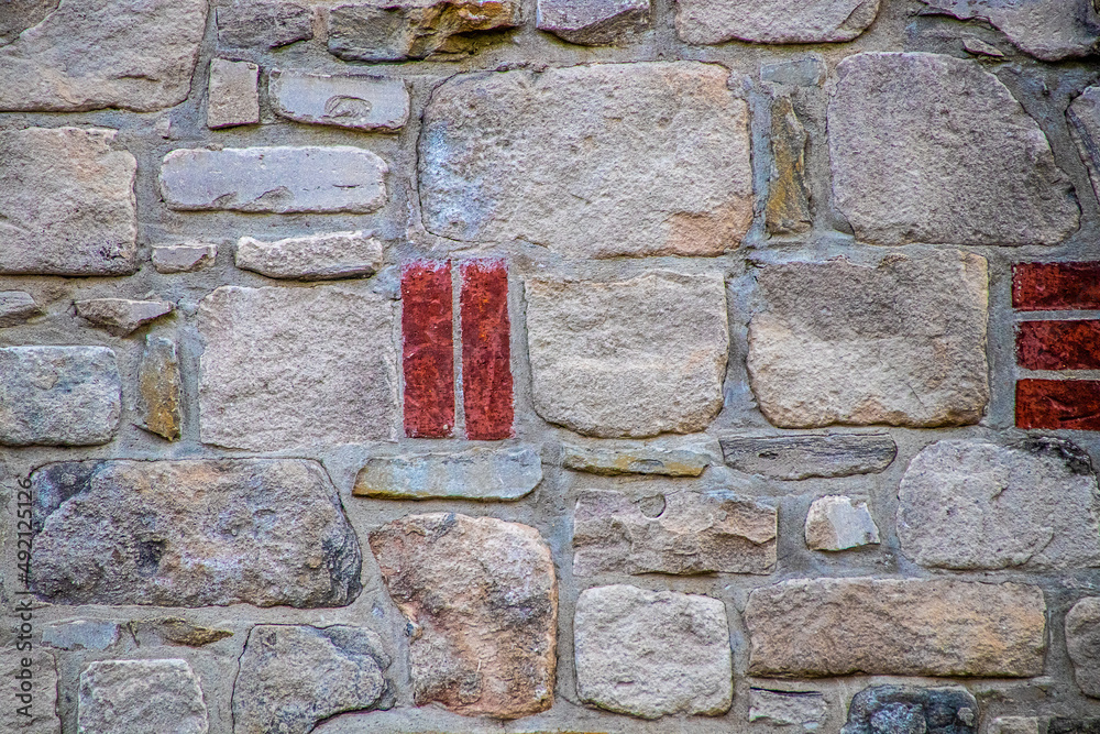 Background of light colored rock wall with a few red bricks for accent - grainy mortar and sandstone texture