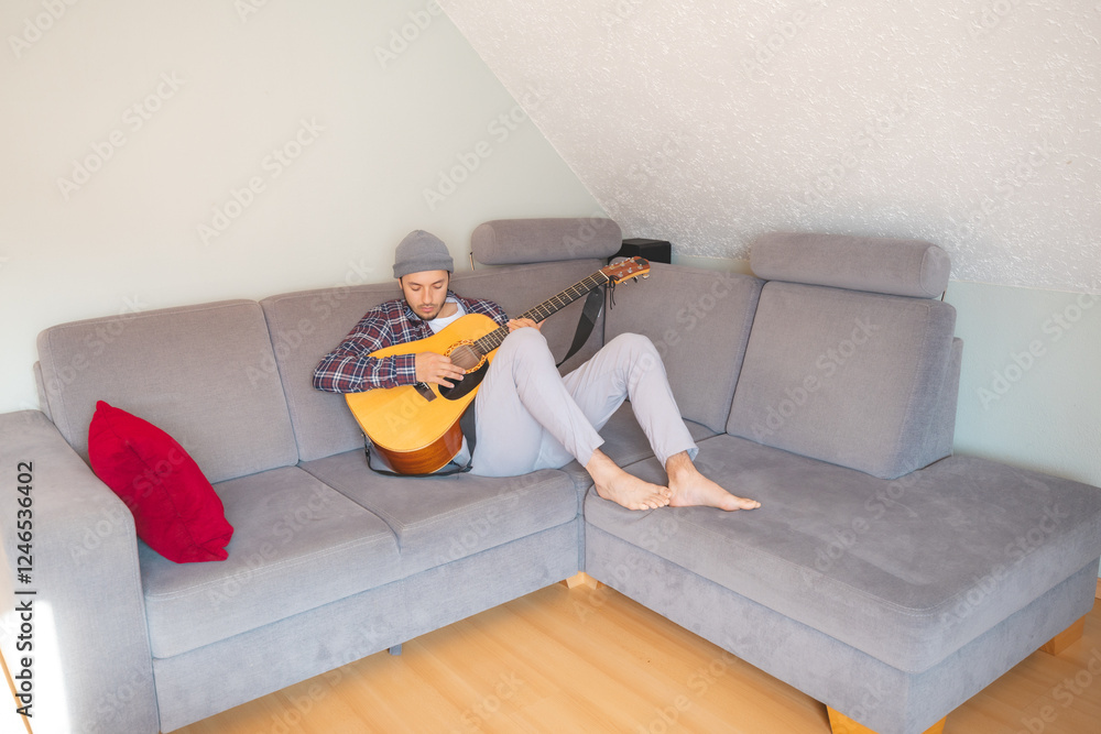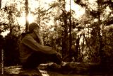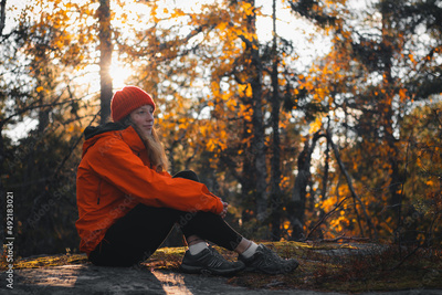 beautiful brunette traveller is sitting on top of a hill on a rock, resting after a hard climb. Sunset on top of a mountain in Vuokatti, Kainuu region, Finland. Natural smile of a girl in her 20s