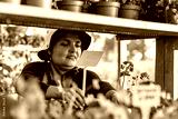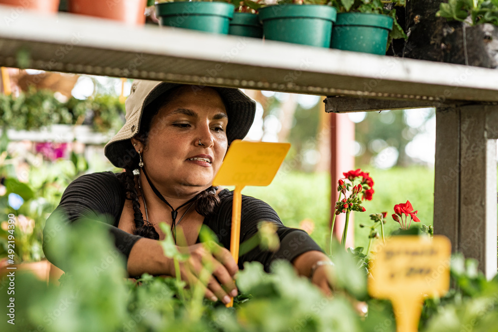LATINA WOMAN WITH A SOMBRERO CARING FOR PLANTS IN HER HIBERNATION GARDEN