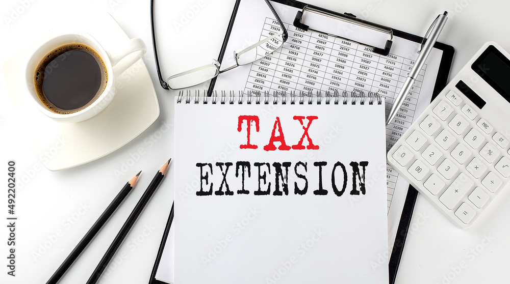 TAX EXTENSION text on the paper with calculator, notepad, coffee ,pen with graph