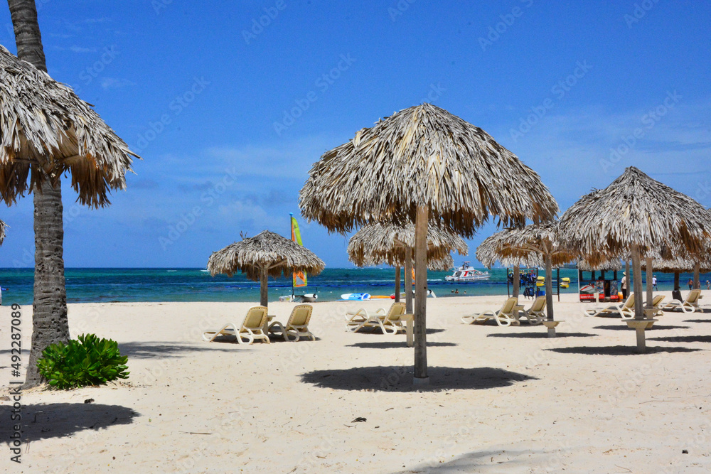 Punta Cana, Dominican Republic - Thatched sun umbrellas on white sand beach, Caribbean coast