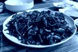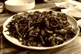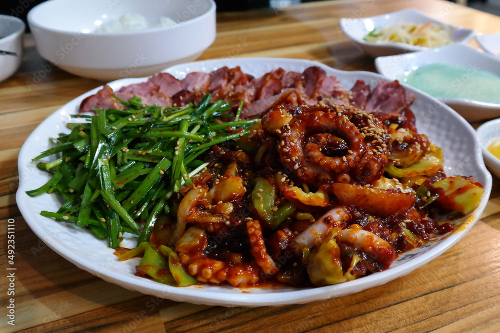 spicy stir-fried octopus and seasoned chives, which are famous as health foods in Korea, are served.