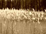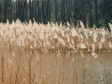 Przedwiośnie nad jeziorem. Słoneczny dzień. Suche, żółte kłosy wodnych traw kołyszą się na wietrze.