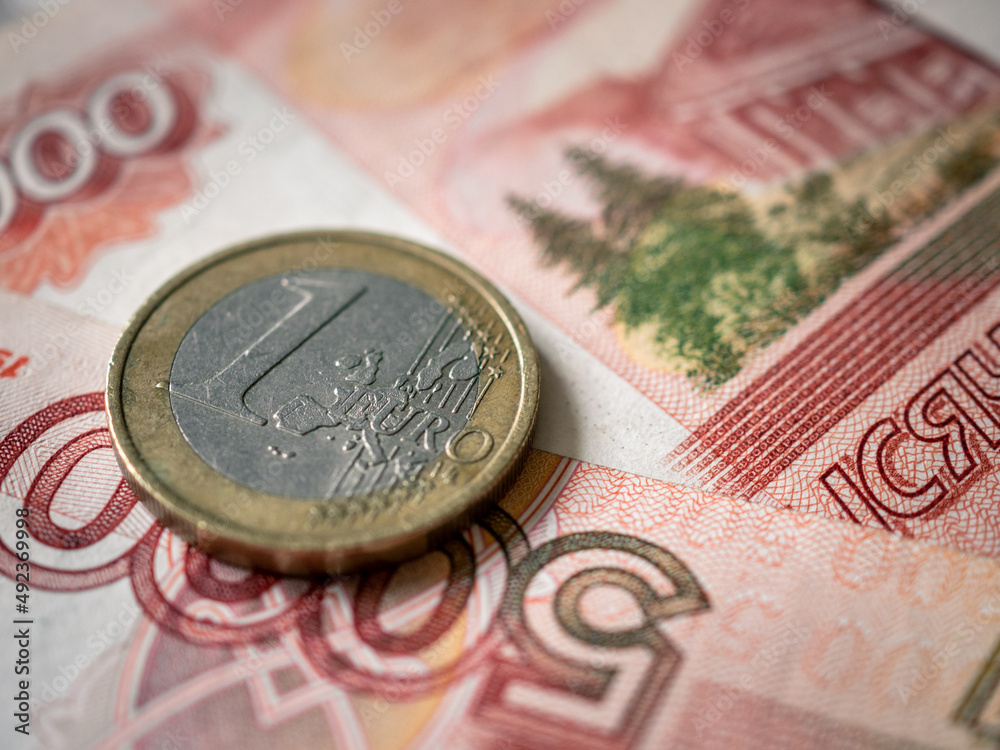 Euro and rouble. Foreign currency exchange. Russia and EU. Economic crisis. Russian money. Investment, business and finance. Emerging markets. Money background. Money in cash. Euro coin on roubles