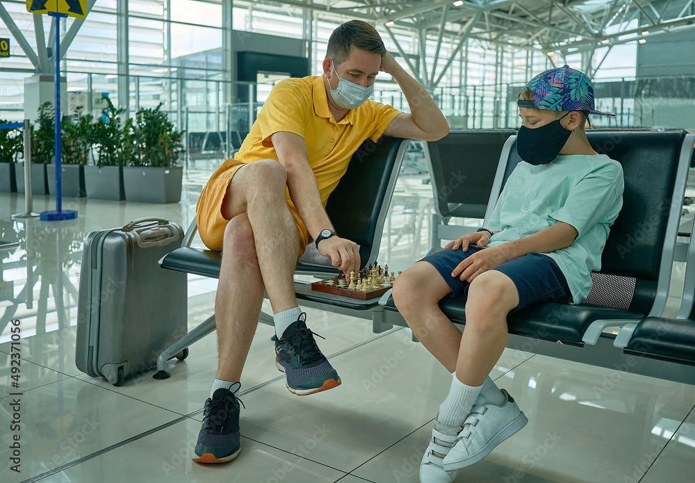 Father and son waiting aircraft in airport. Family tourist playing chess. They sit in the departure hall with their suitcases and wait for the arrival of the plane.