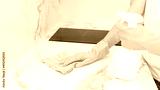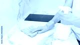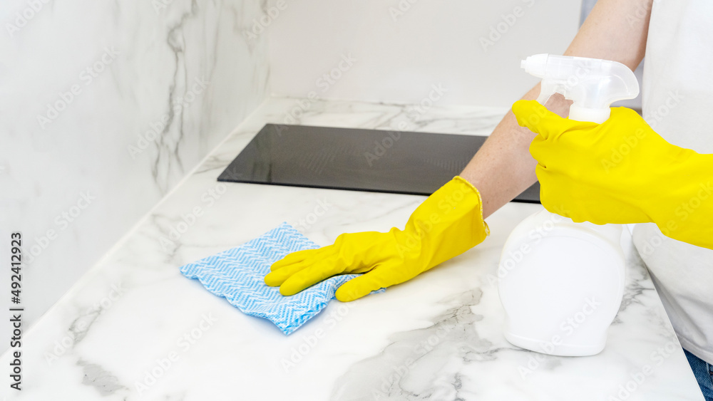 Beautiful woman in protective gloves cleaning kitchen cabinet