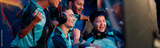 Side view of excited professional cyber gamers team celebrating success while participating in esports tournament in gaming club
