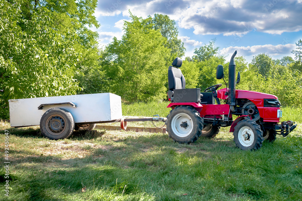 Small mini red modern new tractor with trailer standing at farm, field, nature countryside during sunny summer day. Small agricultural machinery. Rural country farmland background