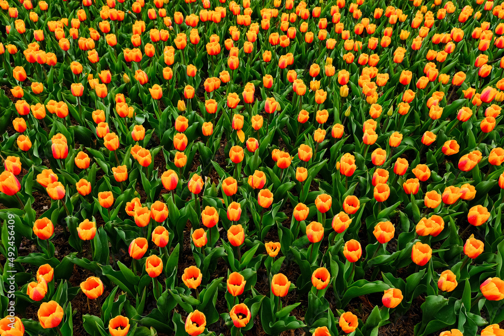 Beautiful field of yellow, orange and red tulips close up. Spring background with tender tulips. Pink floral background. spring banner.