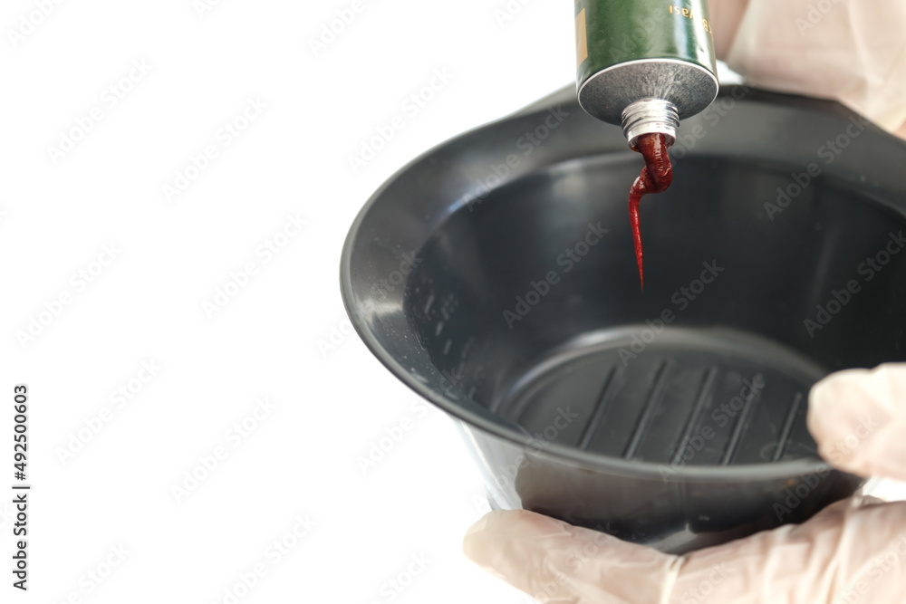 Gloved hands preparing organic hair dye at home. Blank copy space for texts. Close up shot of making organic hair dye for men, male, women and female.