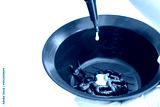 Gloved hands preparing organic hair dye at home. Blank copy space for texts. Close up or closeup shot of making organic hair dye for men, male, women and female.
