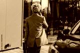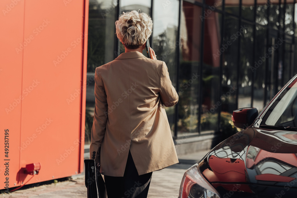 Back View of Elegant Business Woman with Briefcase in Hand Talking on the Phone Near the Luxury Car