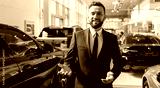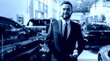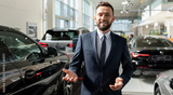 charismatic respectable car dealership owner greets new customers in the showroom with a smile on his face