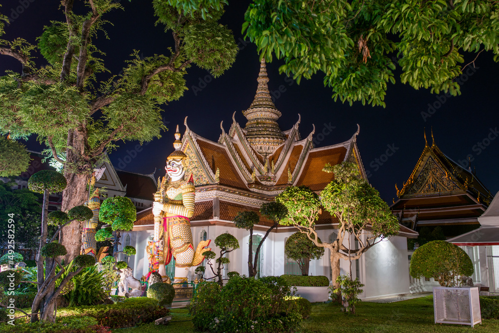Wat Arun Temple of Dawn Buddhist temple with guardians protecting gates. Bangkok, Thailand.