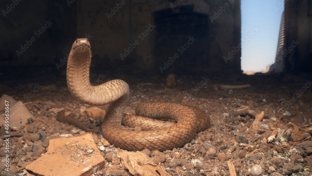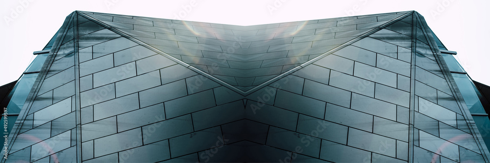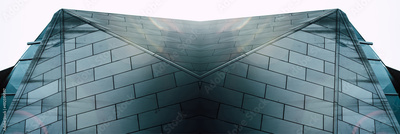 underside panoramic and perspective view to steel blue glass high rise building skyscrapers, business concept of successful industrial architecture