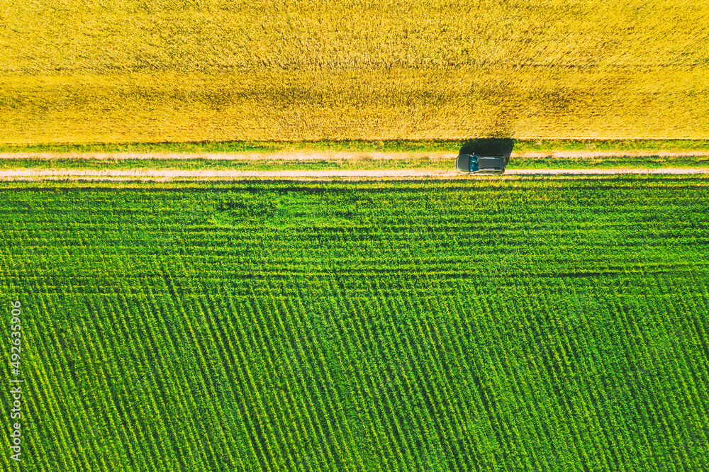 Aerial View Of Car SUV Parked Near Countryside Road In Spring Field Rural Landscape. Car Between Young Wheat And Corn Maize Plantation.