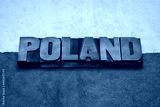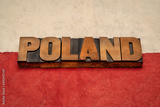 Poland word abstract in vintage letterpress wood type against paper abstract in white and red colors of Polish national flag