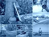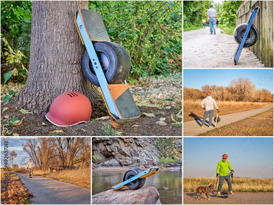 riding one wheeled electric skateboard on bike trails in Colorado and Missouri, a picture collection featuring the same senior male model, all images copyright by the photographer