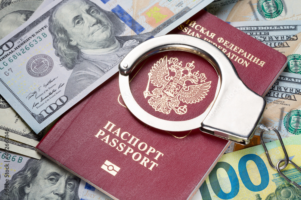 Russia Sanctions and Ukraine war concept. Russian Federation passport with handcuffs on american dollars. Currency ban in Russia