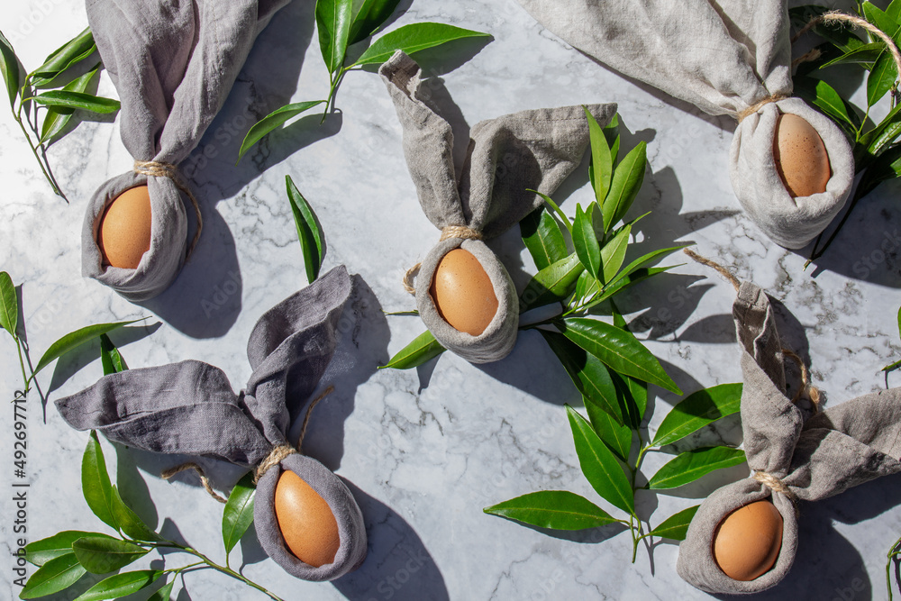 Festive easter background with Easter bunny eggs on linen napkin. Easter decoration, top view. Copy space