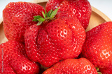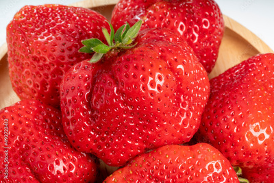 Red strawberries on wooden bowl in wooden background, Fresh Amaoh Strawberry on wooden plate background.