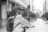 Smiling cheerful senior cyclist woman on bicycle in city street turns and looks at camera. Active elderly grandmother enjoying a healthy lifestyle and freedom