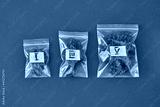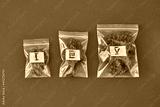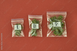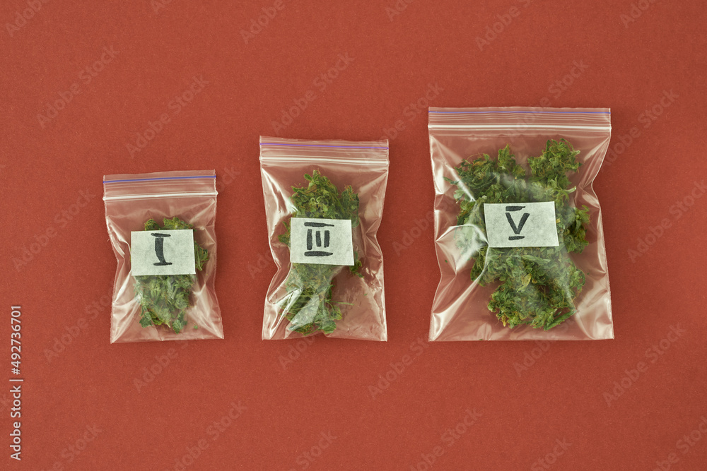 Set of packages with marijuana on red background