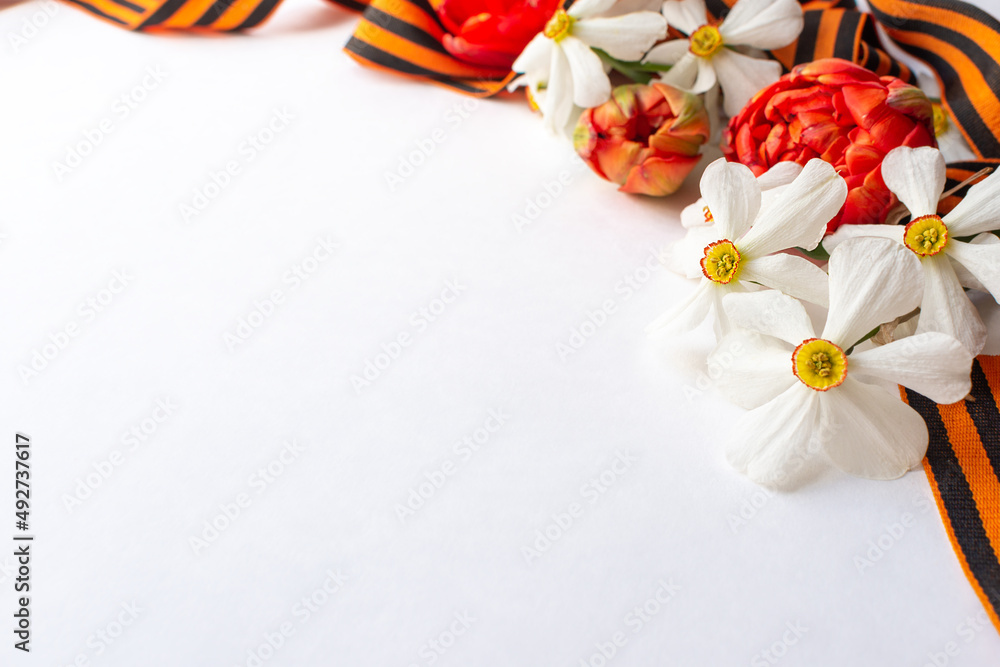 Banner for May 9. Military St. George ribbon, flowers, space for text. Great Victory Day 941-1945 and Defender of the Fatherland Day.