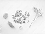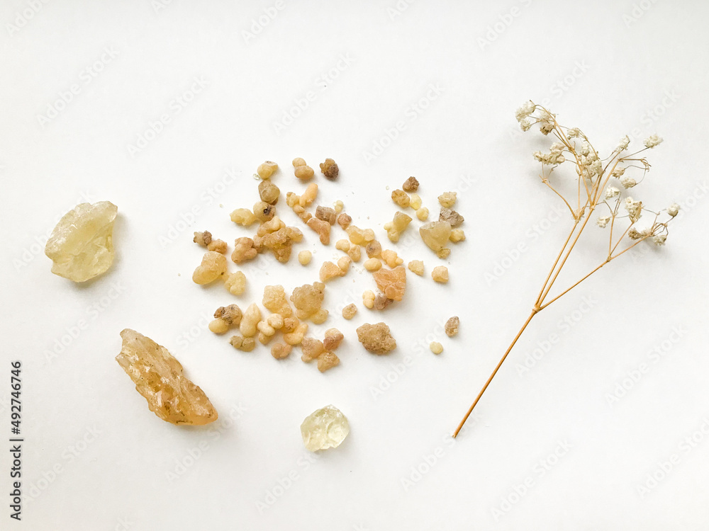 Set of natural resins and twigs of dried flowers , frankincense close-up on a white background