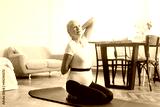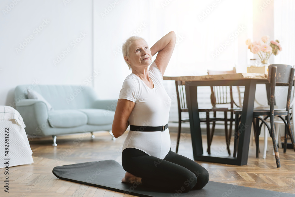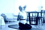 elderly woman sitting in a yoga pose in front of an open laptop.