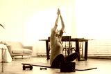 elderly woman sitting in a yoga pose in front of an open laptop.