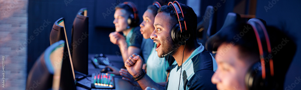 Team of professional esport gamers with happy man in focus playing in video games on cyber games tournament indoors