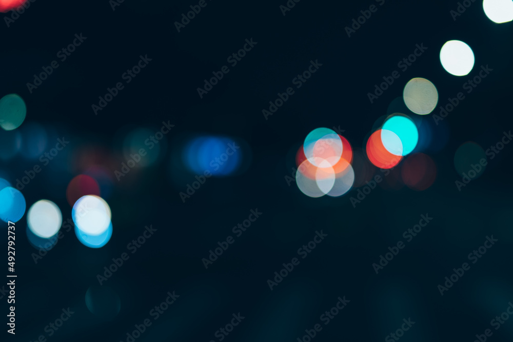 Night city street lights bokeh dark background.
