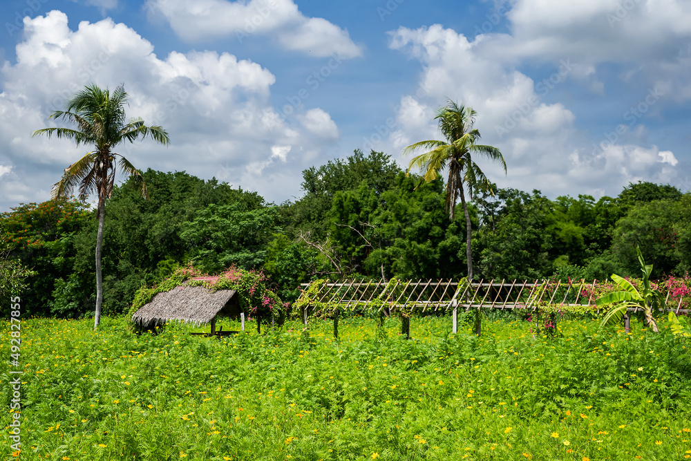 Yellow cosmos flower field With mountains and skies in the background