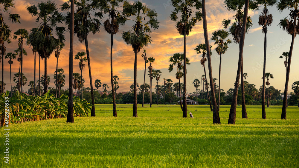 The landscape of sugar palm plantations and rice fields, mixed plantations in Thailand
