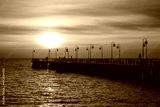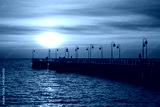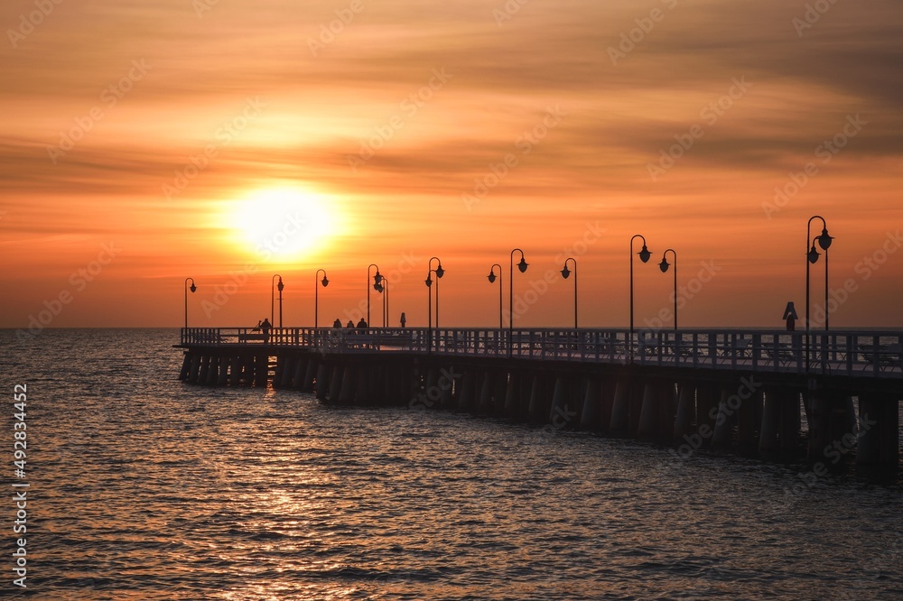 Colorful seaside morning landscape. Wooden pier on the sea at sunrise.