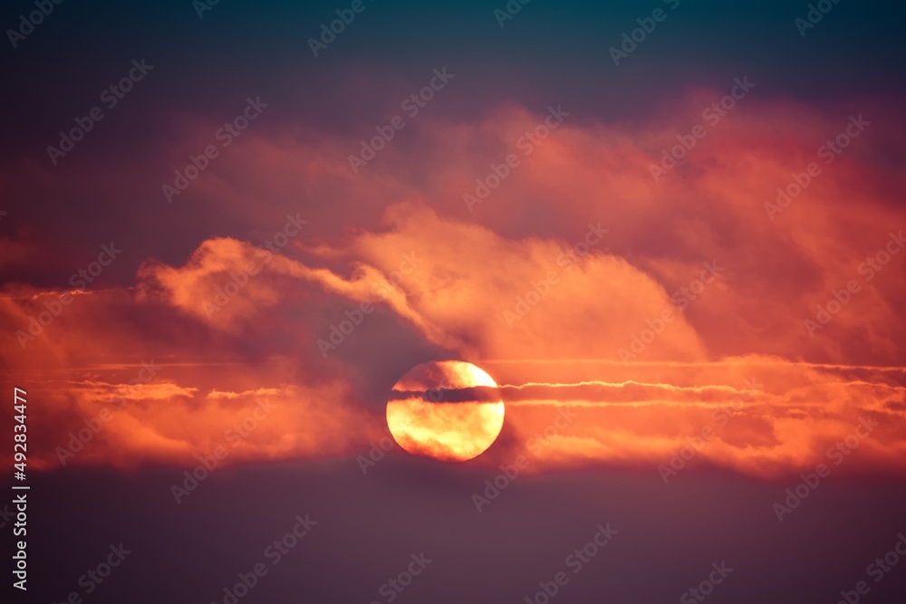 Beautiful colorful abstract piece of heaven. Yellow sun on a background of clouds at sunset.