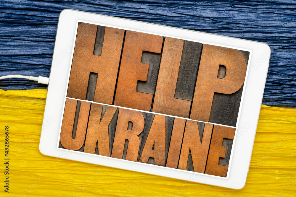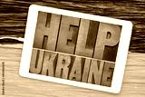 help Ukraine - words in vintage letterpress wood type on a digital tablet against blue and yellow paper background in colors of Ukrainian national flag, support concept
