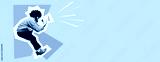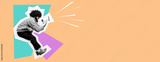 Funny portrait of an emotional jumping guy with a megaphone. Collage in magazine style. Flyer with trendy colors, advertising copy space. Discount, sale season. Information concept. Attention news!