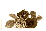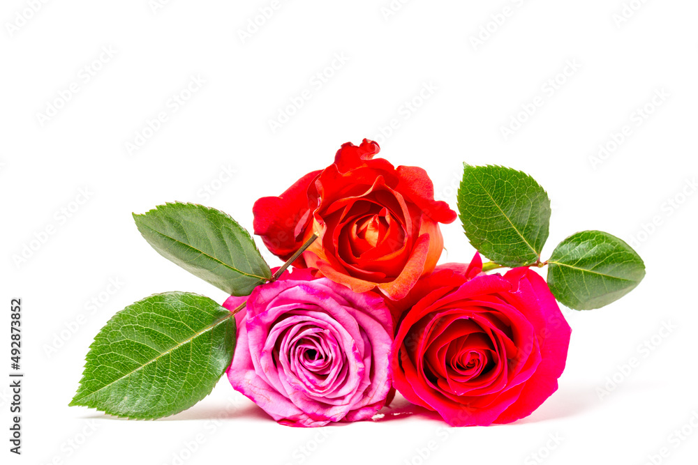 Beautiful colorful rose buds with green leaves isolated on white background