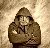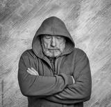 portrait of sad, gloomy and contemplative senior man with closed eyes in a hoodie against grunge wall