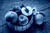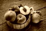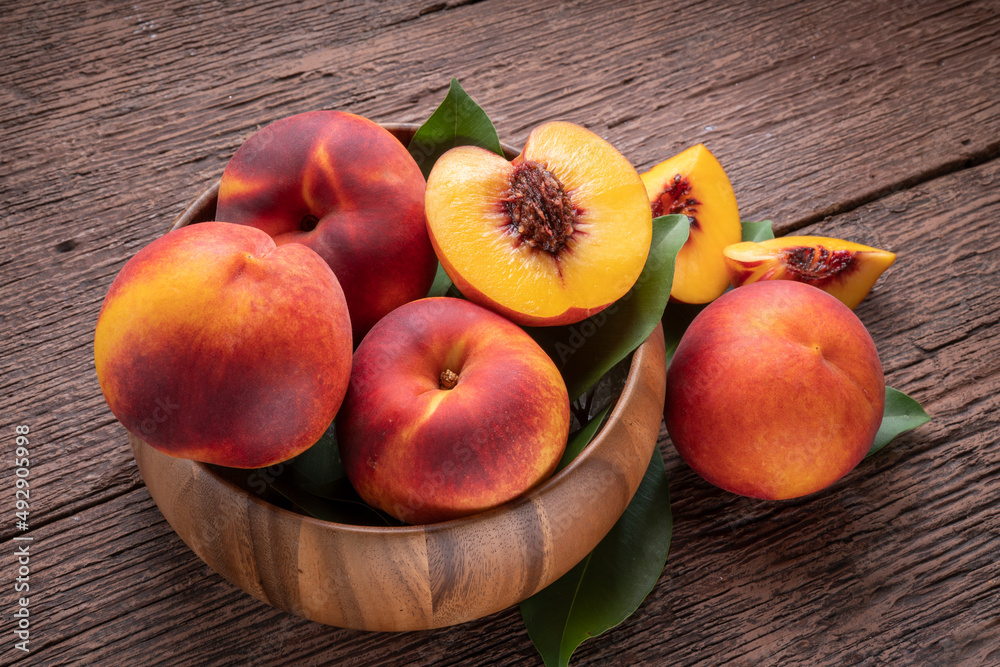 Fresh Yellow Peach fruit in wooden bowl on wooden background., Yellow Peach with slice in wooden basket,