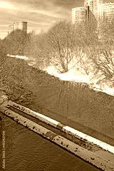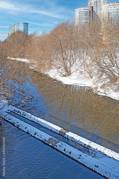 Floodplain of the river in urban development on a sunny winter day