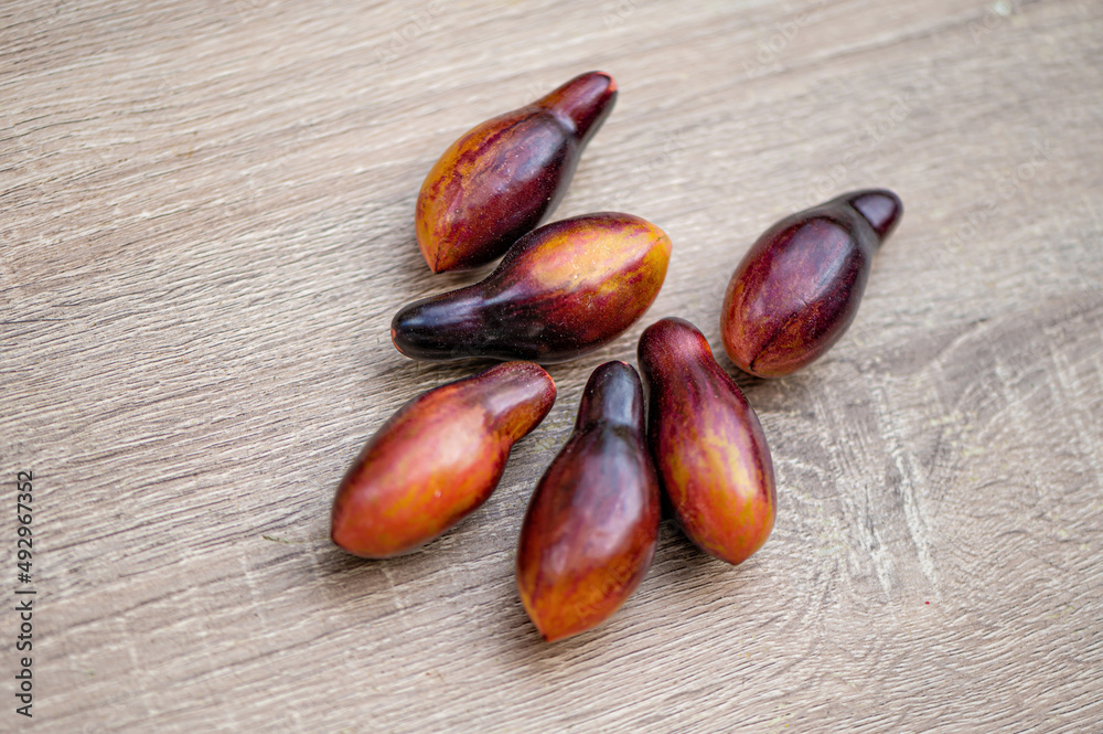 fresh picked multicolored striped and streaky black, purple, and red tomatoes on a wooden table