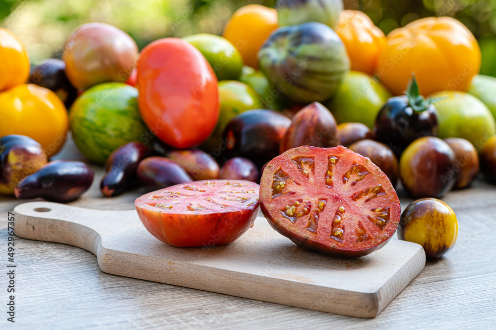 table with a cutting board with sliced tomatoes and different colored tomatoes in the background