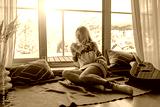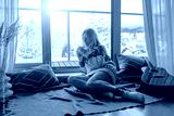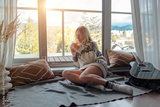 Woman in knitted wool sweater drinks tea a cup, relax at home in winter day. Health care, authenticity, sense of balance and calmness. Fresh air.
