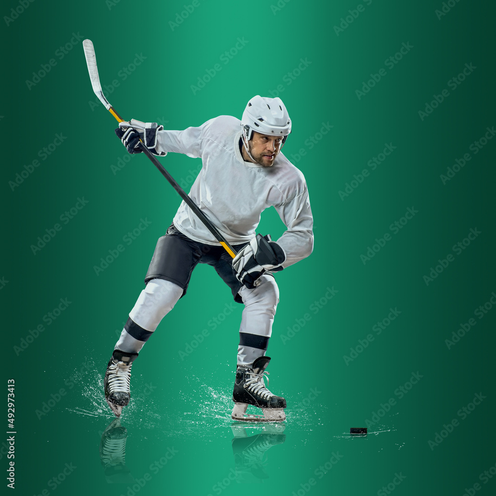 Professional ice hockey player hitting puck for winning goal in action on gradient multicolored neon background. Concept of sport competition.
