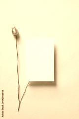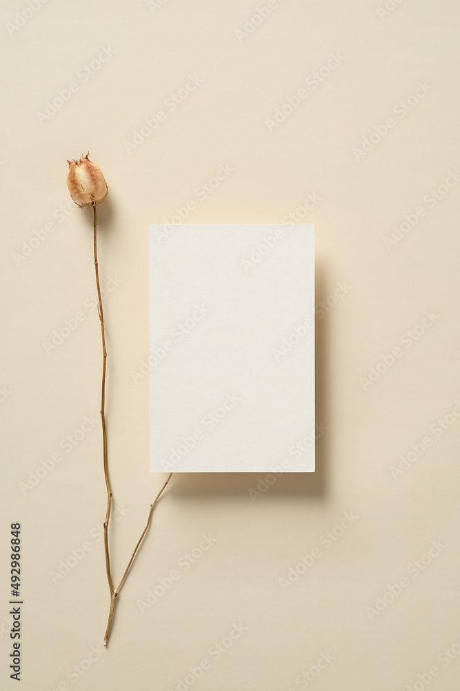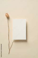 Blank greeting card mockup and dried flower on beige table. Wedding invitation template. Boho, minimal style.