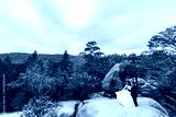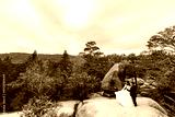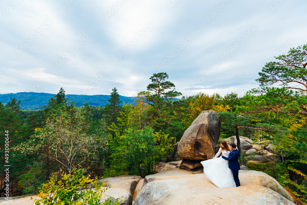 the newlyweds embracing each other and smile against the background of the rocks and trees