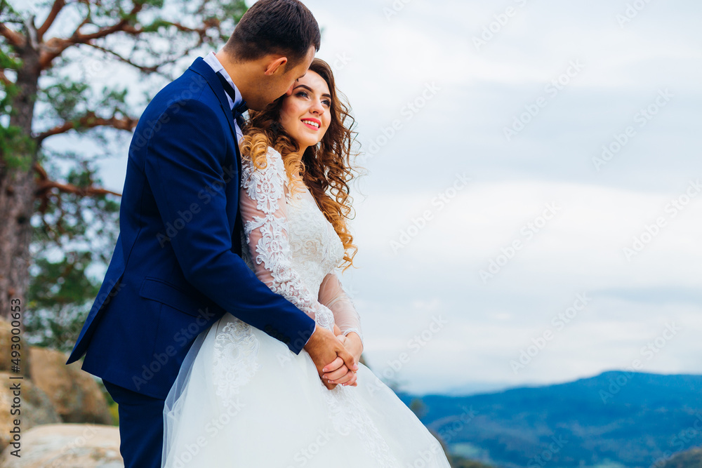 close-up of the groom embraces the bride from the back side on the rocks with a magnificent view